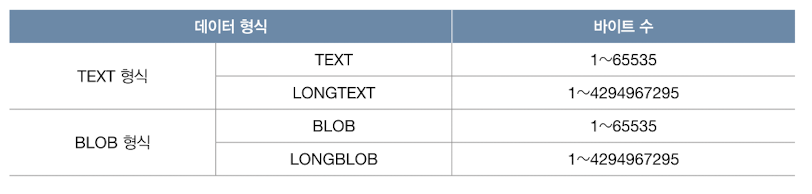 - BLOB(Binary Long Object)는 이미지, 동영상 등의 이진 데이터이다.
