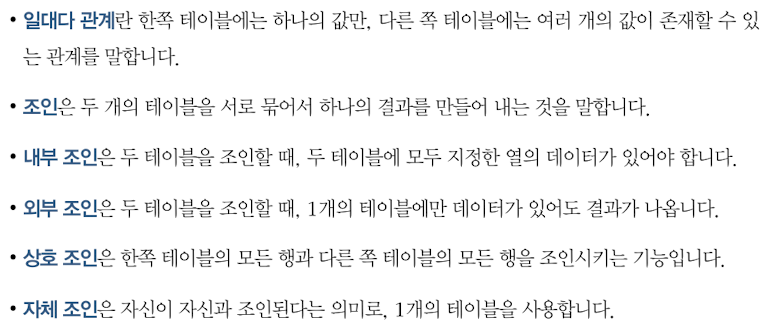 - 두 테이블의 조인을 위해서는 테이블이 일대다 관계로 연결되어야 한다